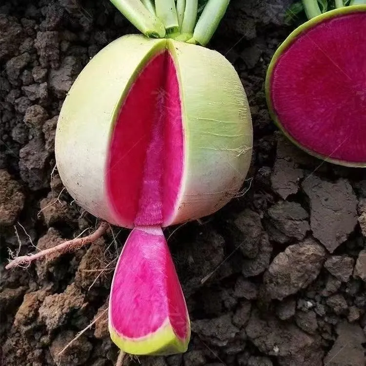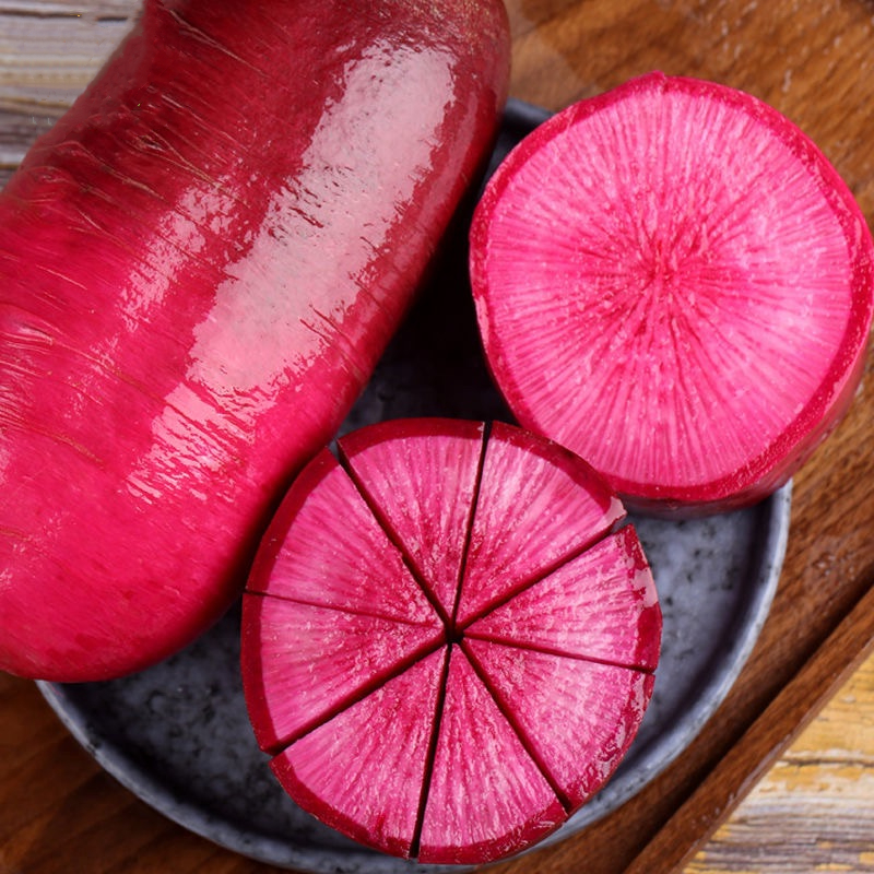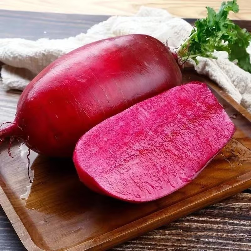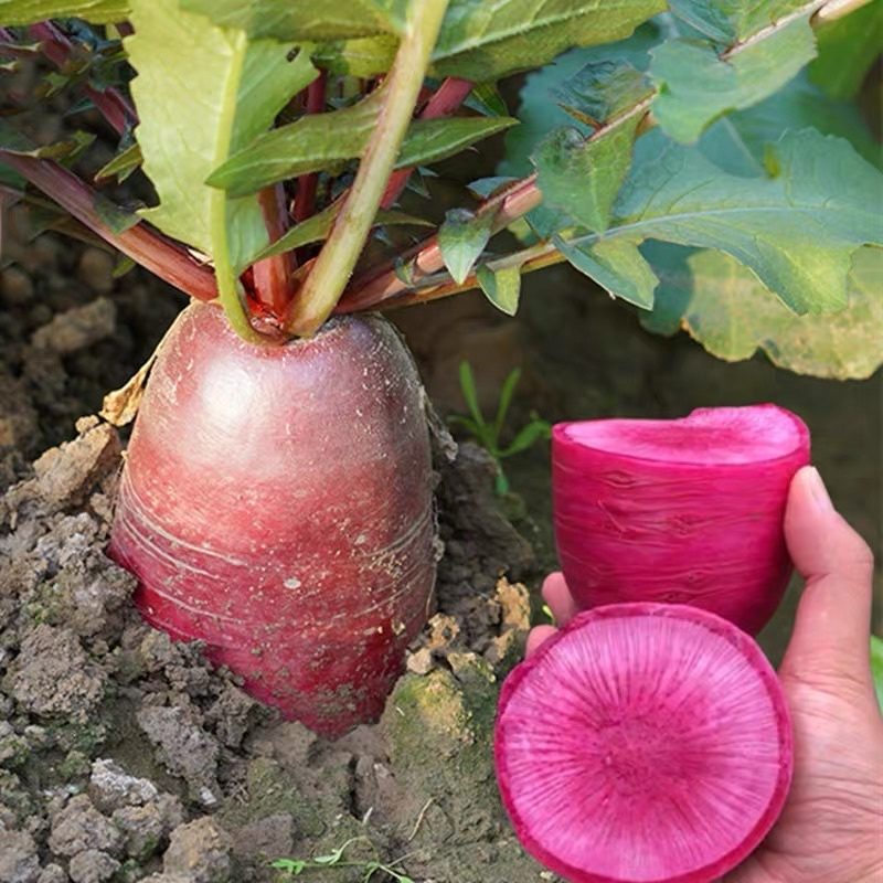 Purple Beauty radish is also called "pineapple radish" because its shape is somewhat similar to pineapple. The skin of the Purple Beauty radish is smooth and red, and the inside is purple-red. It resembles a dragon fruit and has a bright and pleasant appearance. The taste is fresh, crisp and sweet. It takes 7 to 12 days to germinate and 2 to 3 months to mature.